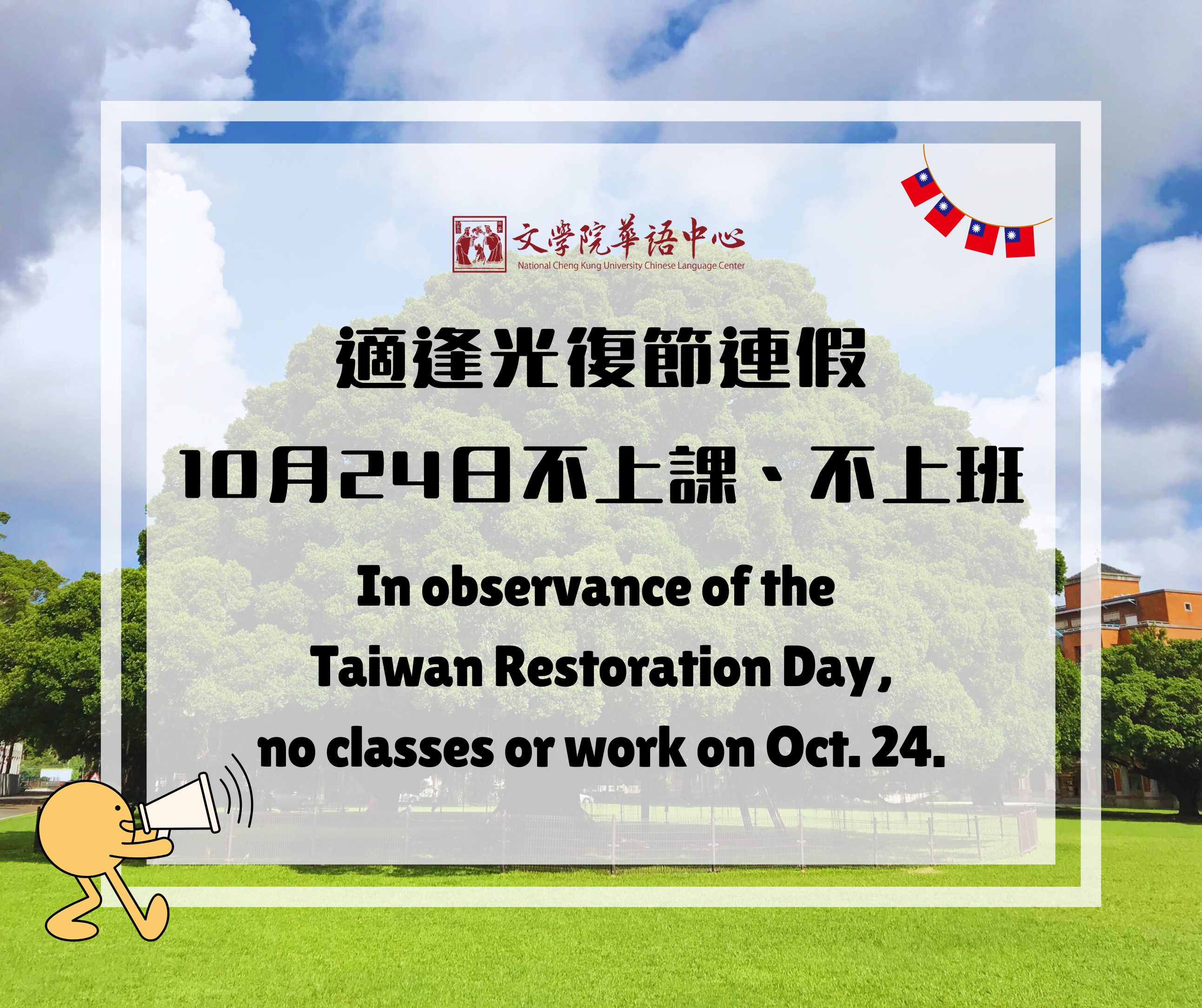 In observance of Taiwan Restoration Day, there will be no classes or work on Oct. 24.